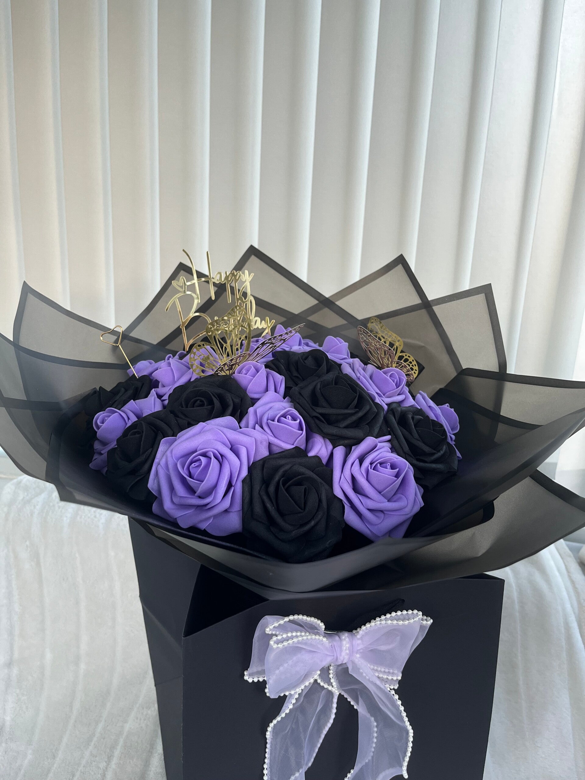 Ein Schwarz-Lila Bouquet mit ungefähr 25 Rosen. Verziert mit goldenen Schmetterlingen, einem Happy Birthday Aufsatz + GESCHENKTÜTE.