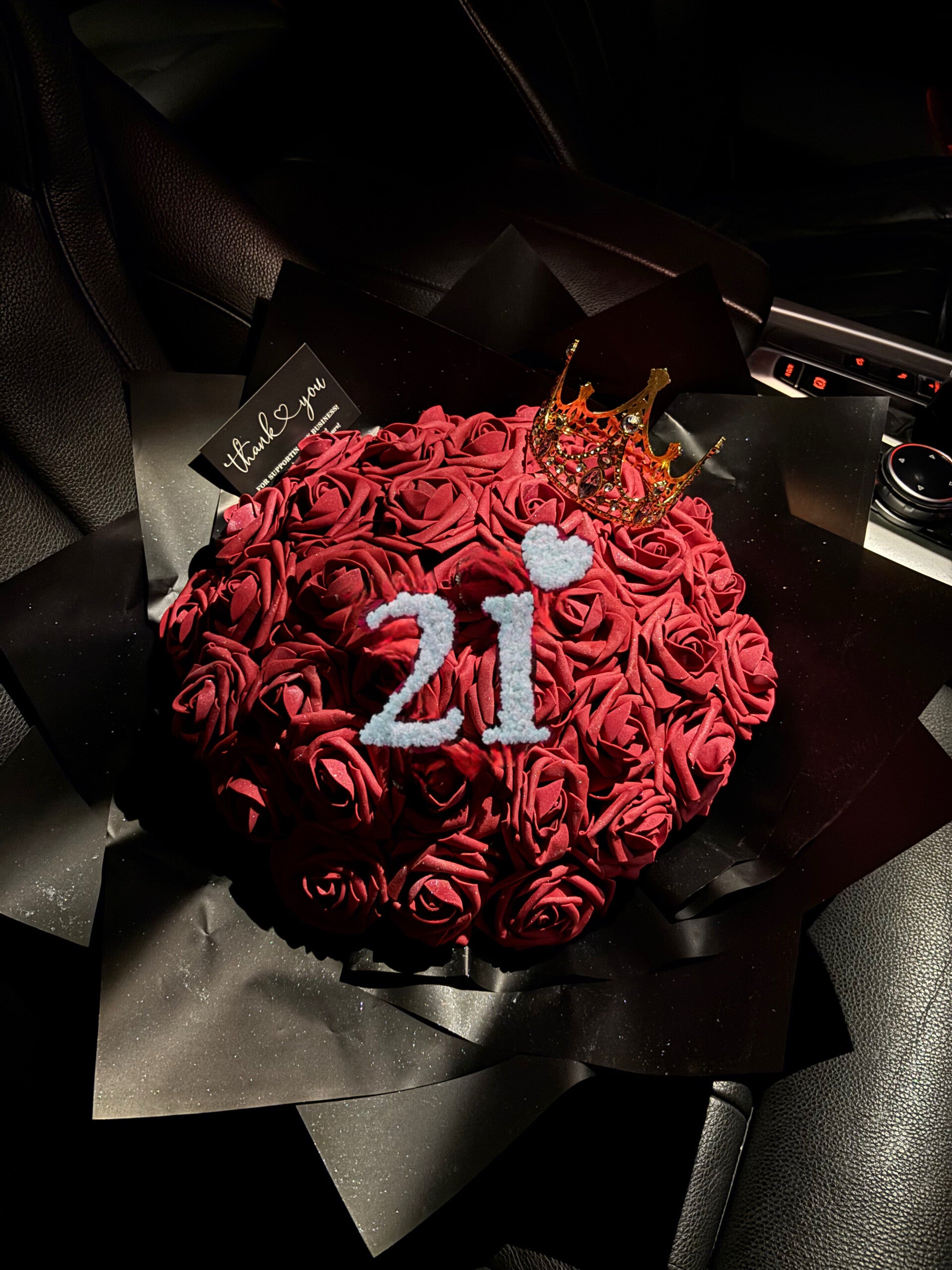 Bouquet mit 35 Rosen und Zahl mit Herz. Mit Glitzer und Krone.