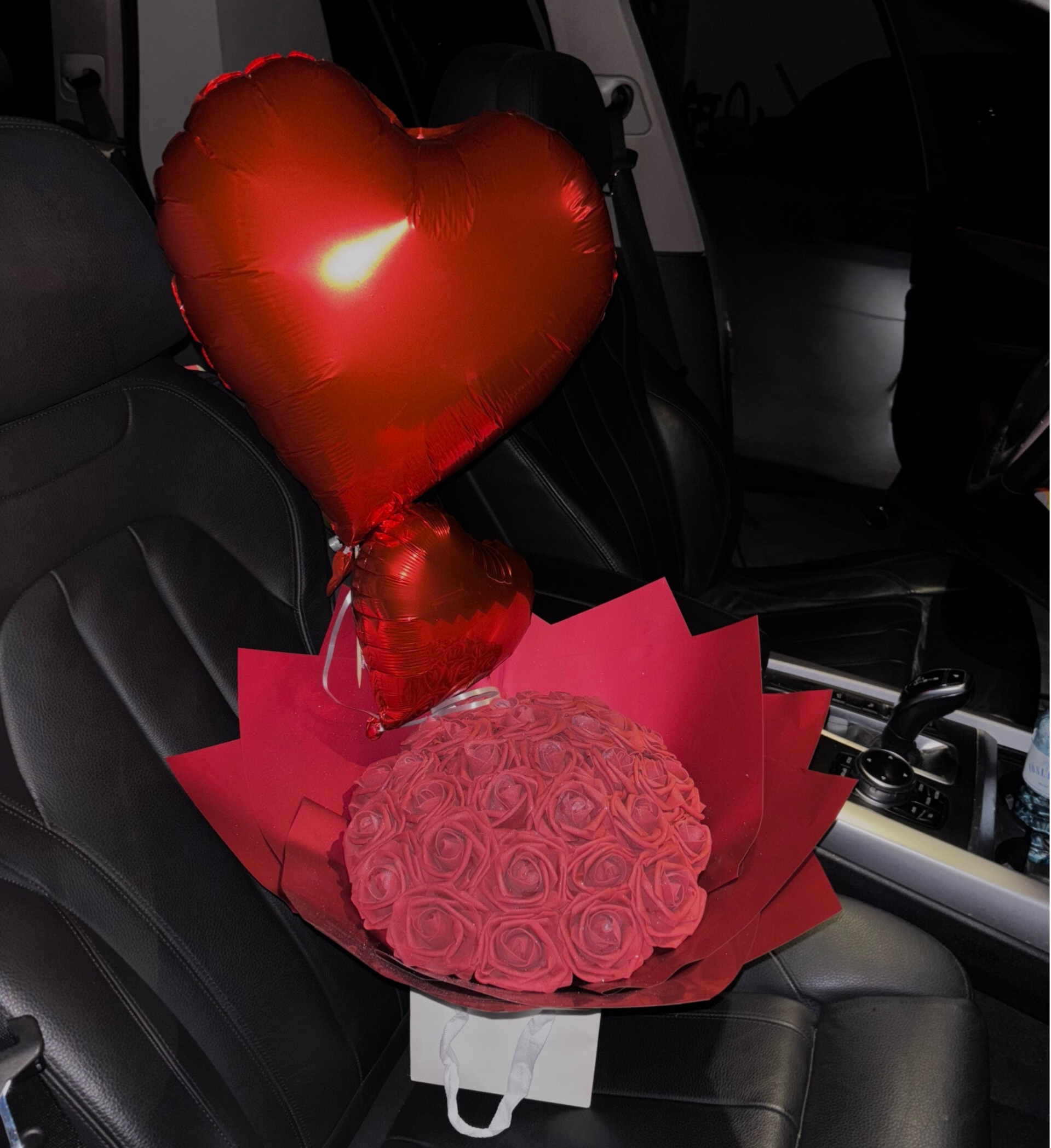 Bouquet aus ca. 35 roten Rosen mit Schleife und Helium Herzballon und Glitzer.